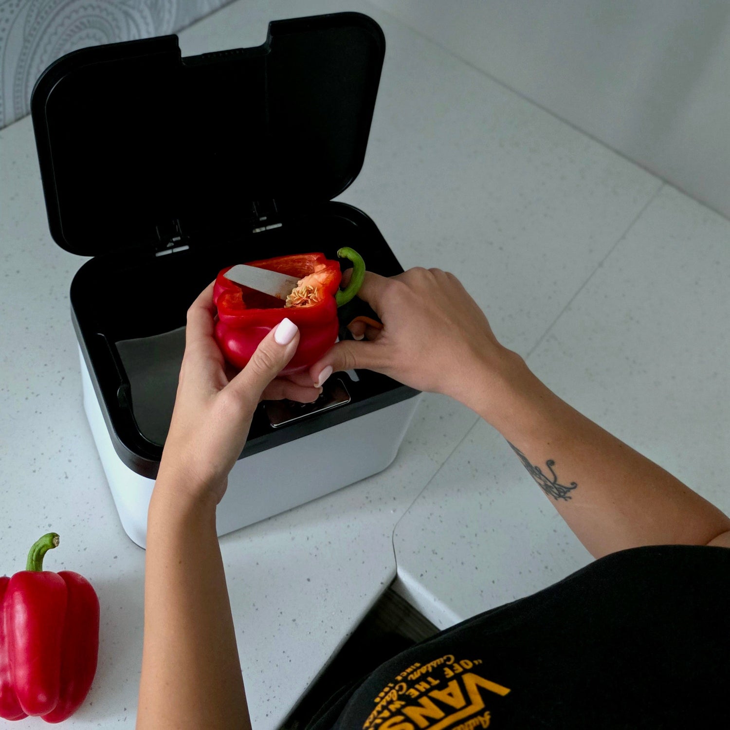 Väga praktiline, mugav kasutada ja samal ajal istub segamatult köögi tööpinnal oma stiilse tagasihoidlikkusega peites hoolikalt kõiki neid biojäätmeid :)